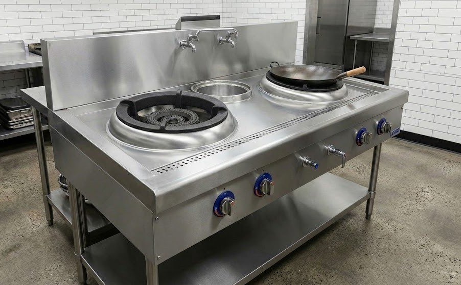 เรียกว่า "เตาจีน หรือ เตาฟู่" (Wok Range / Kwali Range) โดยการวางหัวเตาจะอยู่ประมาณช่วงกลาง และมีแถวเดียว ต่างจากเตาฝรั่ง เพราะต้องการพื้นที่สำหรับการใช้งานกระทะที่มีขนาดใหญ่